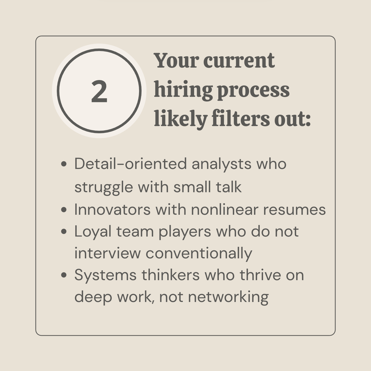 After 15 job rejections, Sarah was hired in 2 weeks through our revised intake process. She saved the company $50K by implementing a new system within 90 days.